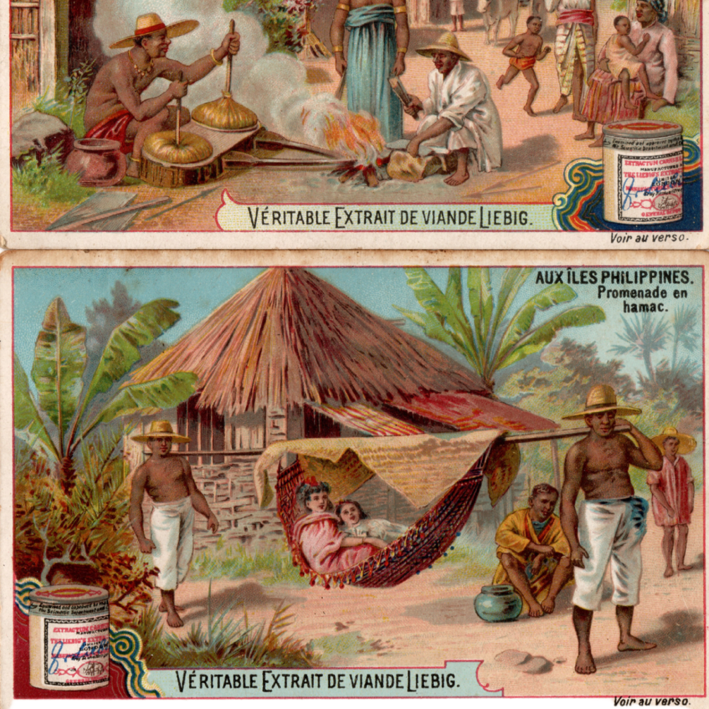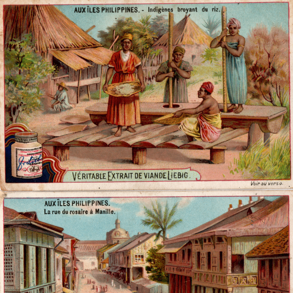 A complete set of six original nineteenth century hand-colored Liebig trading lithographs on various sceneries of everyday life in the Philippines. The sceneries include a.) the Harbor of Manila, b.) Life in the Market, c.) Rosario Street in Manila, d.) Natives Pounding Rice, e.) Dwellings of Islanders near a Smithy, and e.) Women in a Sedan Chair carried by two male porters. All lithographs are signed with Liebig's ink and advertising texts appear on verso. This series comes from the French edition.
