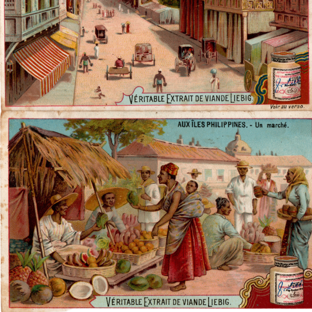 A complete set of six original nineteenth century hand-colored Liebig trading lithographs on various sceneries of everyday life in the Philippines. The sceneries include a.) the Harbor of Manila, b.) Life in the Market, c.) Rosario Street in Manila, d.) Natives Pounding Rice, e.) Dwellings of Islanders near a Smithy, and e.) Women in a Sedan Chair carried by two male porters. All lithographs are signed with Liebig's ink and advertising texts appear on verso. This series comes from the French edition.